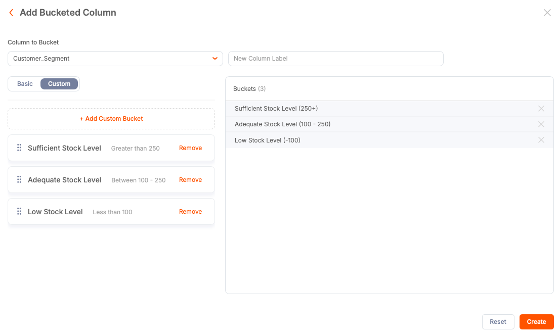 Static buckets are most useful when the ranges and labels you need do not depend on other columns or changing logic. They are ideal for grouping numeric measures into simple, static categories such as low, adequate, and sufficient.