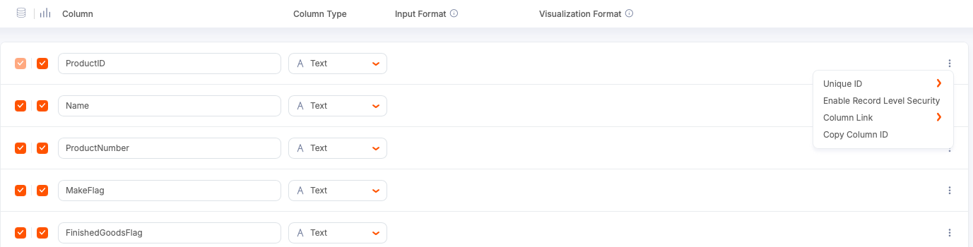 Select the options menu for a column (for example, ProductID), then select Enable Record Level Security.